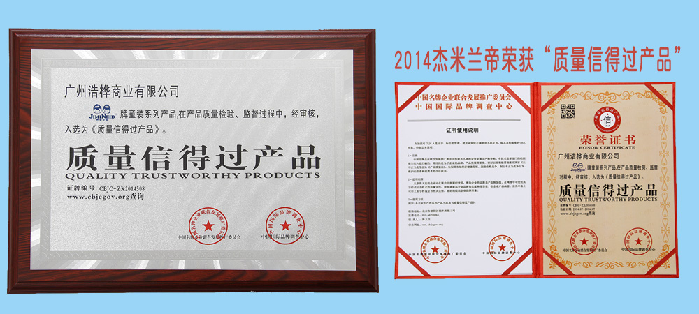 2016年初歲末,杰米蘭帝對自身的發展進行一個回顧,在過去的幾年,杰米蘭帝員工經過不斷的努力拼搏,品牌逐漸得到了社會各界和行業內的熟知與肯定,品牌曾榮獲行業內:“中國童裝行業暢銷品牌”、“中國名優產品”、“中國著名商標準”、“中國名牌企業聯合發展推廣委員會優秀單位”等的榮譽,其中在2014年7月,榮獲“質量信得過產品”。