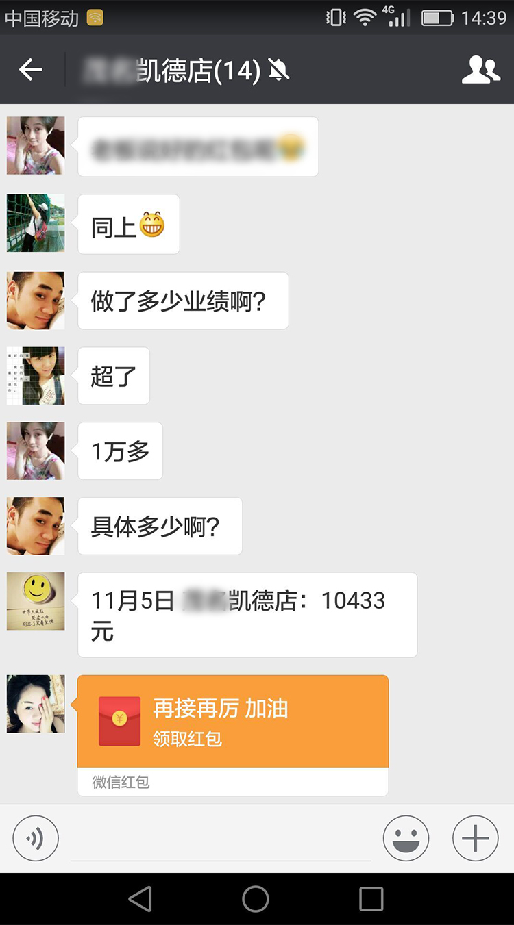 可喜可賀,開業當天,業績突破2萬,借此感謝杰米蘭帝人的努力。李小姐給予微信紅包形式,進一步激勵杰米蘭帝人再接再厲,創造更好的銷售業績。