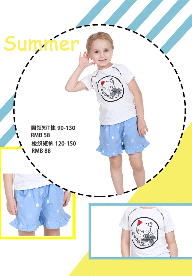 白色圓領T恤以及藍色梭織短褲配以卡通圖案,簡潔不乏時尚潮流。